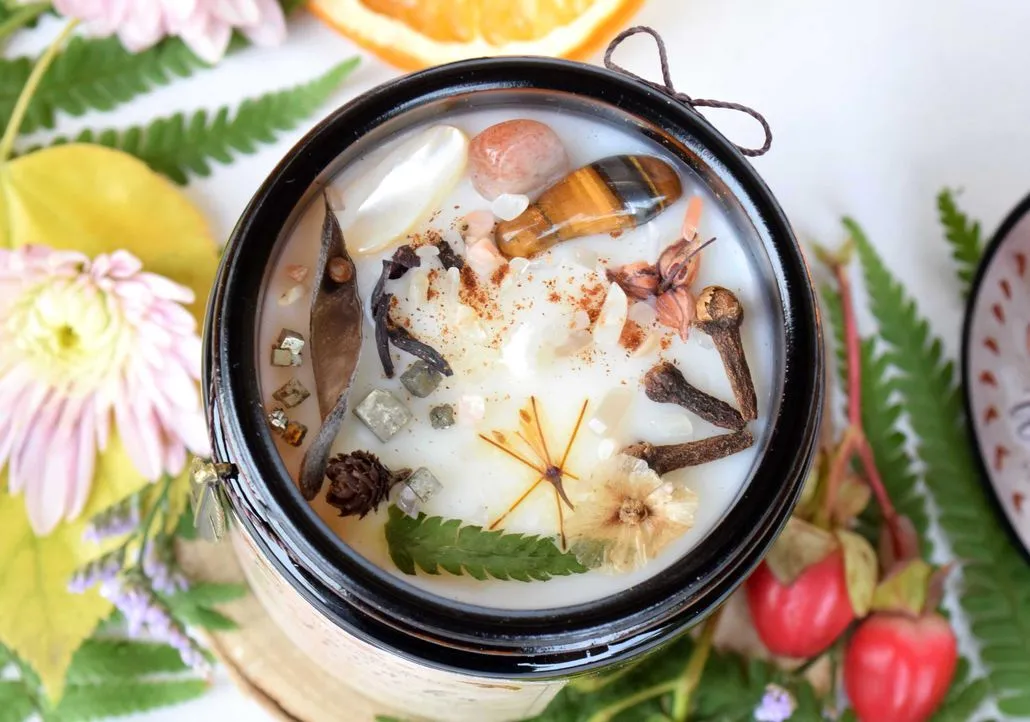 Ke zdobení svíček používám biologicky odbouratelné třpytky, minerální kameny a sušené květy, bylinky a plody, které se po zapálení svíčky ponoří do rozpuštěného vosku, kde zůstanou ukryté až dokud svíčka nevyhoří cca 0,5 cm nad dno. I přesto, že jsou svíčky pečlivě testované a prověřené mnoha lety zkušeností, před zapálením svíčky pro jistotu odstraňte větší hořlavé ozdoby, které mohou zasahovat do ohně. Typicky se jedná o dřevnaté a větší kusy zdobení jako je badyán, skořice či sušené citrusy a plody, které se neponoří do rozpuštěného vosku tak snadno jako je tomu u lisovaných květin a nehořlavých minerálních kamenů, třpytek a dalších ozdob.