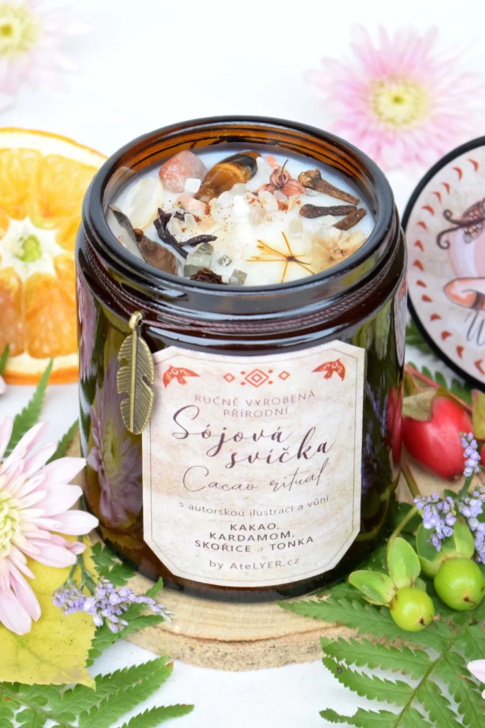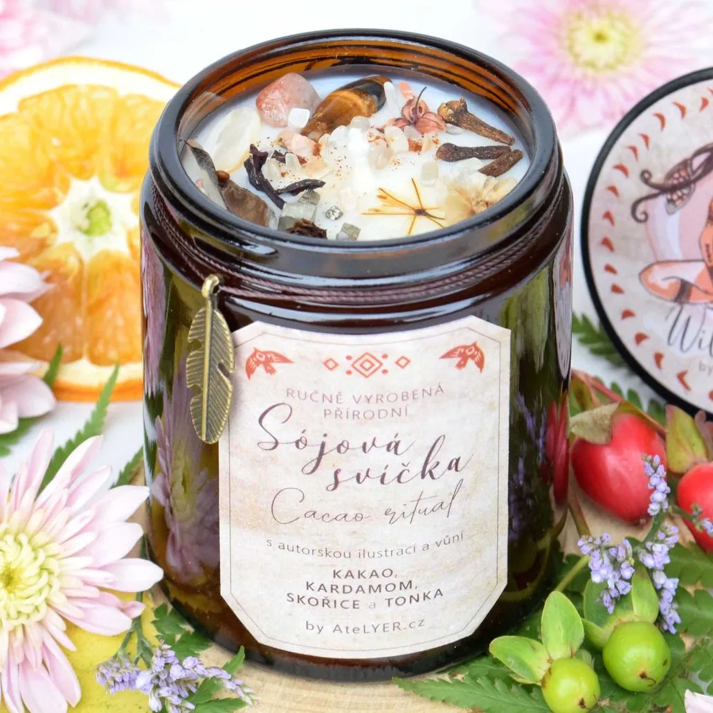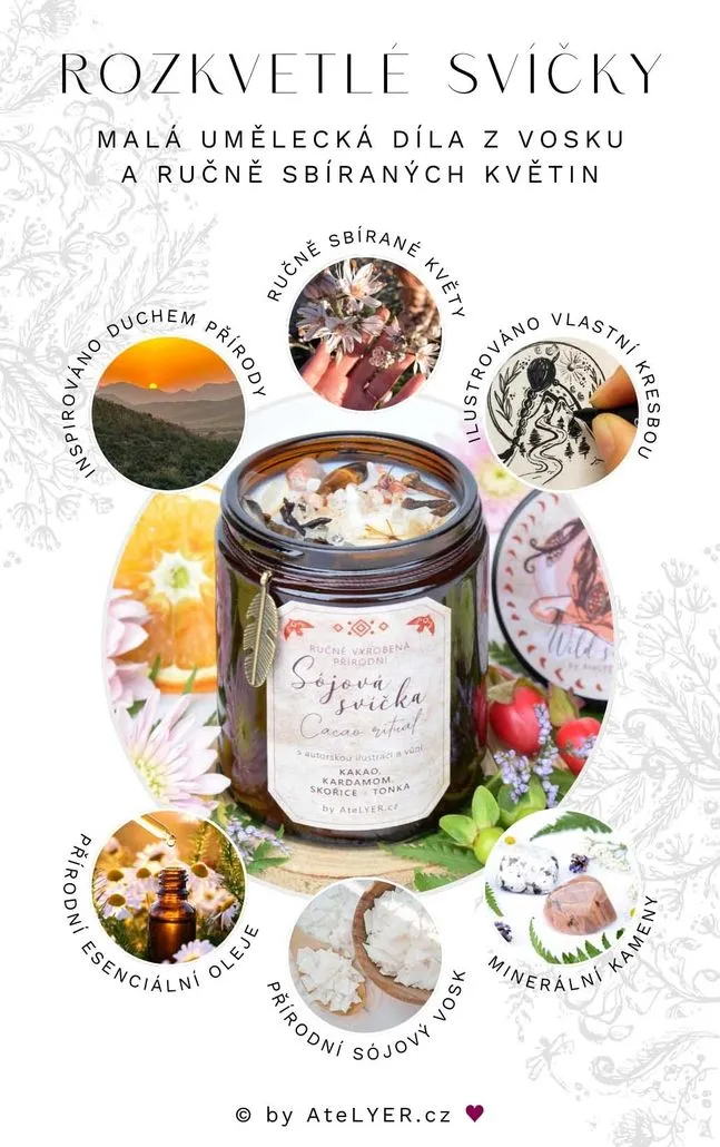 Ručně vyráběné svíčky tvořím jako malá umělecká díla v limitovaných edicích, které vám vypráví svůj příběh skrze každičký detail. Obsahují ten nejkvalitnější sójový vosk, který má dlouhou dobu hoření a je šetrný nejen k našemu zdraví, ale také k přírodě. Tematické kompozice dechberoucích vůní vytvářím z esenciálních olejů vyrobených ze skutečných rostlin, květin, bylin a plodů v kombinaci s velikou úctou nejen k přírodě a k jejím darům, ale také k vám. Skutečné kouzlo se ale ukrývá až v překrásném rozkvetlém designu, který tvořím z vlastnoručně sbíraných květin, minerálních kamenů a autorských ilustrací, díky kterým vzniká z „obyčejné“ přírodní svíčky malé umělecké dílo, které vám vyčaruje úsměv na tváři i na duši.
