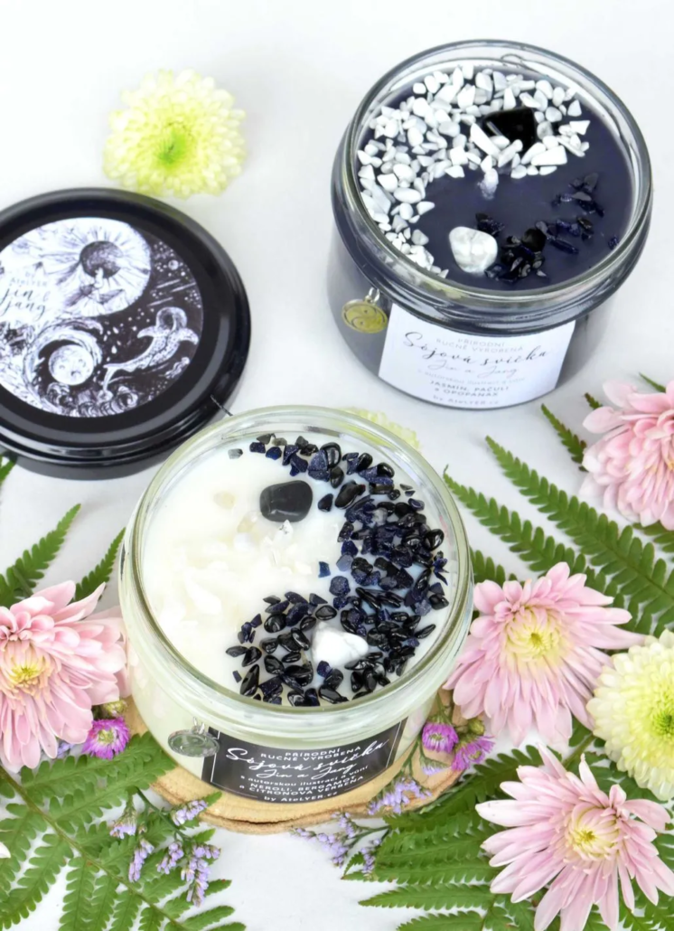 Ta nejkrásnější oslava rovnováhy. Mezi světlem a tmou. Mezi dnem a nocí. Mezi hlubokou intuicí a zářivou energií. To je mystické duo sójových svíček Jin a jang symbolizující dokonalou harmonii protikladů, které se vzájemně doplňují, stvořené ze sójového vosku, esenciálních olejů ze skutečných rostlin, magických krystalů, mé vlastní kresby a přívěsku symbolizujícího rovnováhu, který si zavěsíte na řetízek. Černá svíčka Jin představující noc, vnitřní klid a tichý prostor země, ve kterém vše klíčí a bílá svíčka Jang představující světlo plné života, vitalitu a sílu znovu začít. Vlnovka tvořící rozhraní představuje pohyb a neustálou proměnu, detaily v opačné barvě pak připomínají, že nic není absolutní, protože i v nejhlubší tmě se pomalu rodí světlo a i v největším jasu rostou stíny.